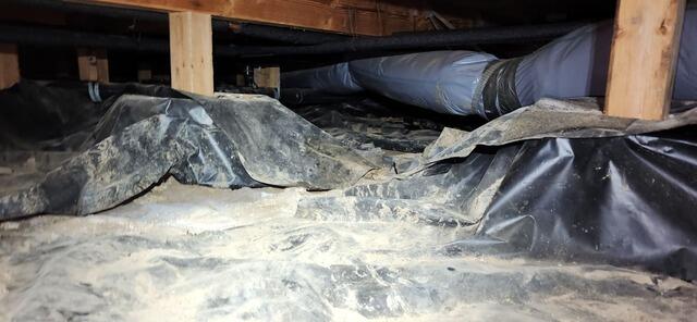When a dirt crawl space does not have a proper vapor barrier, moisture from the soil rises, causing humidity all throughout the home. This introduces musty and damp odors, as well as creates the perfect environment for pests and rodents to thrive. This homeowner contacted John's for a free inspection after finding that their vapor barrier was damaged and lost its protective value. We sent one of our knowledgeable system design specialists out, and after inspecting the crawl space he met with the homeowners to go over the best option to properly protect this crawl space.