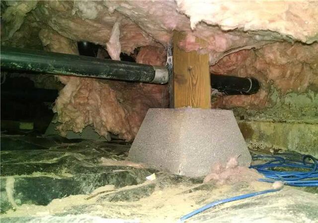 This crawlspace's old vapor barrier was encased in mud and was a very damp feeling. To solve this water issue we did a full crawlspace encapsulation and installed Four SmartJacks to reinforce the structure of the home where wood rot had caused damage.