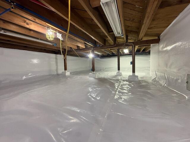 These homeowners were looking to upgrade their crawl space to create additional storage in their home and gave us a call for a free visit. We went out and thoroughly inspected the crawl space and then met up with the homeowners to work on a plan that will help create a stable and healthy environment for them to have peace of mind about their crawl space. The homeowners then signed the estimate and we began this project. We start by removing all of the debris, fiberglass insulation and old vapor barrier. Since there was not much water, we install our SmartDrain system that will alert the homeowner of a possible plumbing leak with an audible alarm and will drain the leak into a drywell underneath the CleanSpace. We then cover all of the vents and seal them shut to prevent outside air from entering. Next, we install our TerraBlock system directly onto the dirt floor of the crawl space and this creates an insulated barrier between the home and the earth that will block any moisture from making its way up. We anchor our 20 mil thick CleanSpace system into the foundation walls, between the footing and wooden posts and over top of the TerraBlock system and this is sealed with our heavy duty CleanSpace tape. To keep the environment controlled we install our SaniDry Sedona. This is our powerful and highly effective dehumidifier that will eliminate damp and musty odors while drying and filtering the air. It will also keep the home at a healthy relative humidity, improving overall indoor air quality. Lastly we install our spray foam insulation directly onto the foundation walls up to the rim joists, filling every crack and void, ensuring a complete airtight seal and no air leaks. With this full encapsulation, these homeowners can be sure their home is protected for years to come and they can now use this clean, healthy and stable crawl space as extra storage.